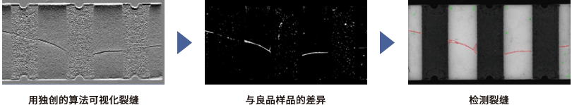 通过切换多个光源,获取在不同时机拍摄的图像。 【TSCDefFinder】着眼于多个图像随时间序列变化的差异,创建适合检查的图像。 从一个方向照射时无法确认的裂缝也被可视化,可以检测为缺陷。